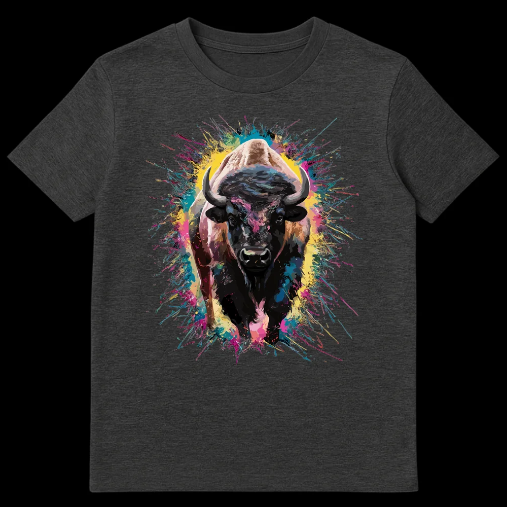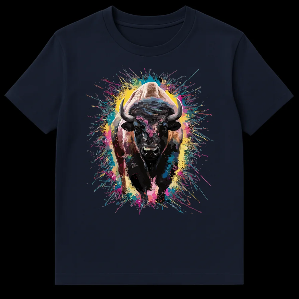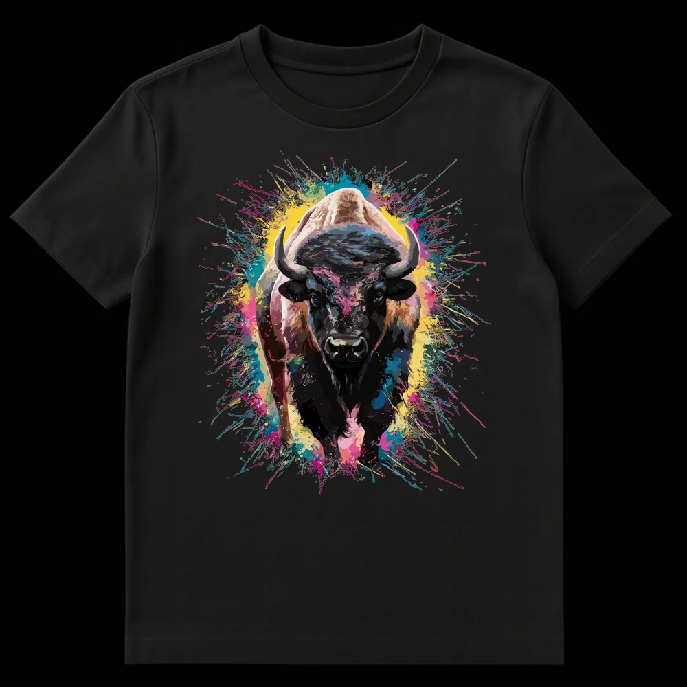 Unleash your wild side with this breathtaking bison design, a vibrant fusion of nature’s power and contemporary abstract art. Featuring a majestic American buffalo emerging from a burst of neon-like splash paint, this shirt celebrates untamed spirit and artistic expression. It’s a striking statement piece and a perfect gift for art lovers, wildlife enthusiasts, or anyone who appreciates bold, unique fashion.
