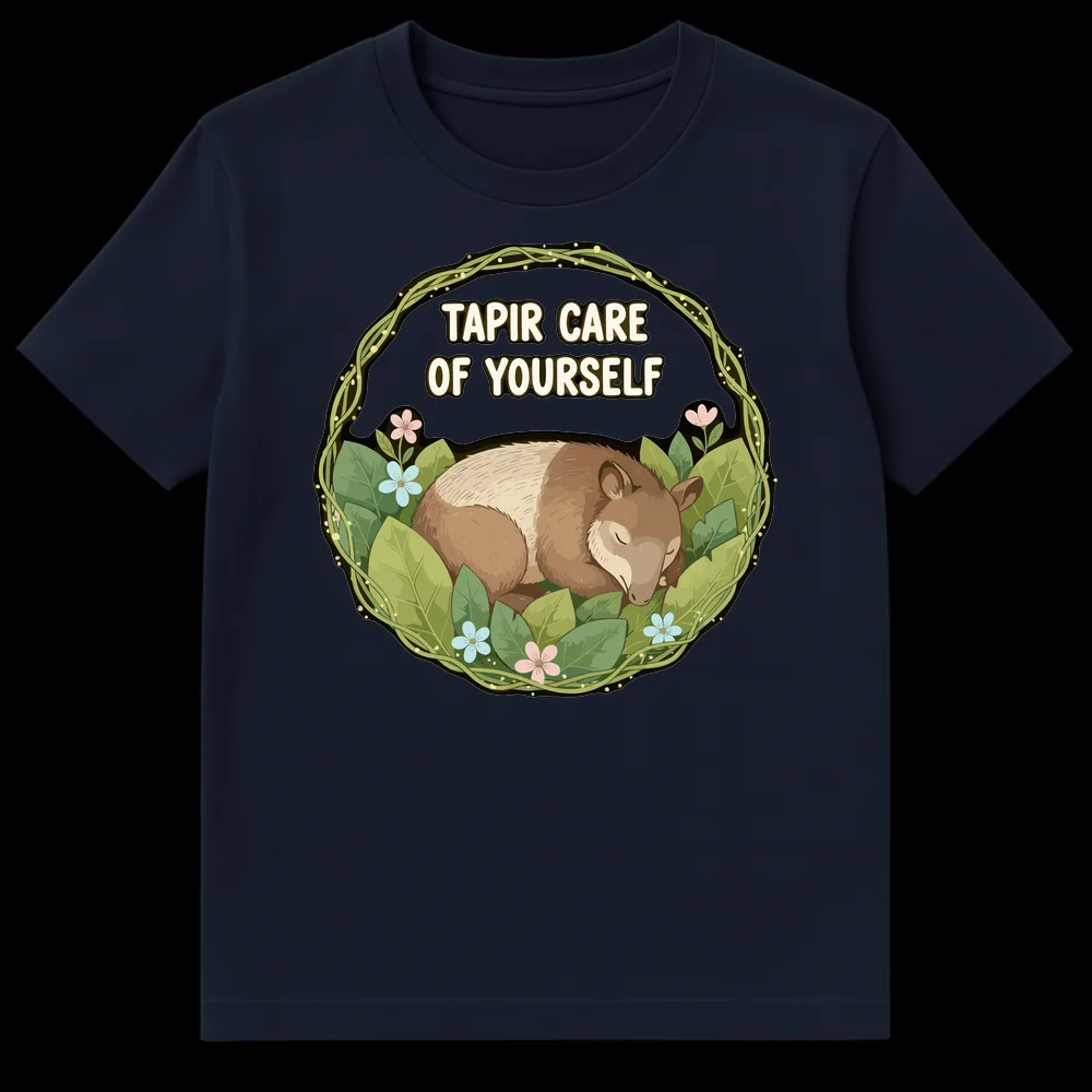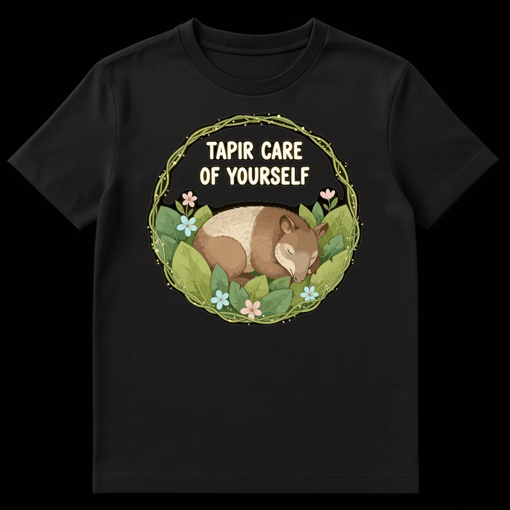 Embrace a chuckle and a comforting message with our “TAPIR CARE OF YOURSELF” t-shirt. This design features a charming, hand-drawn Malayan tapir peacefully napping amidst lush leaves and soft pastel flowers, offering a gentle reminder for self-care through a clever animal pun. It’s a perfect gift for animal lovers, pun enthusiasts, or anyone needing a sweet, encouraging boost.