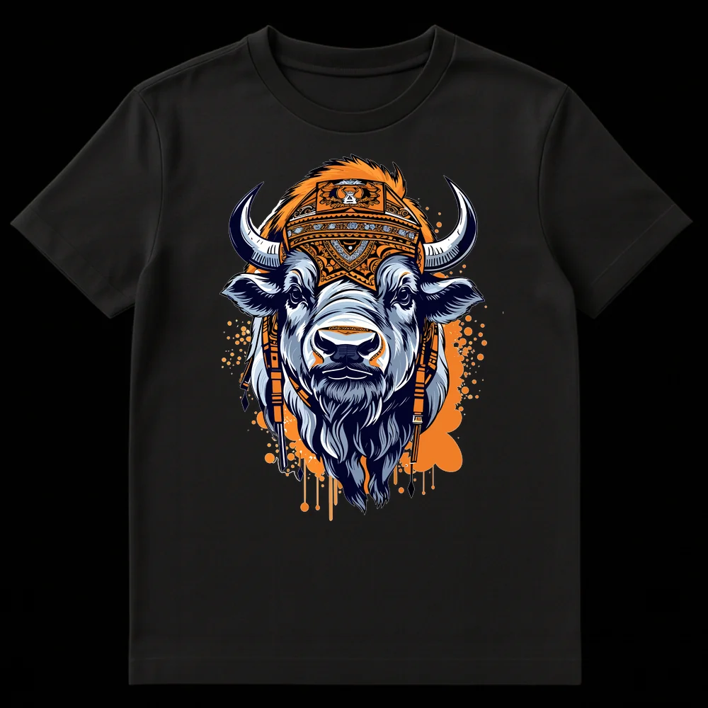 Embrace the power of the wild with this striking bison design, featuring a majestic buffalo adorned with an intricate, culturally inspired headdress. This unique illustration blends powerful animal symbolism with detailed neo-traditional artistry and vibrant orange accents. It’s an exceptional gift for nature lovers, art aficionados, or anyone drawn to tribal aesthetics and symbolic strength.