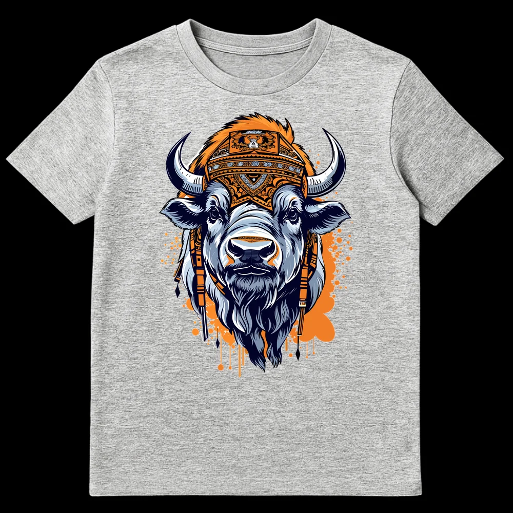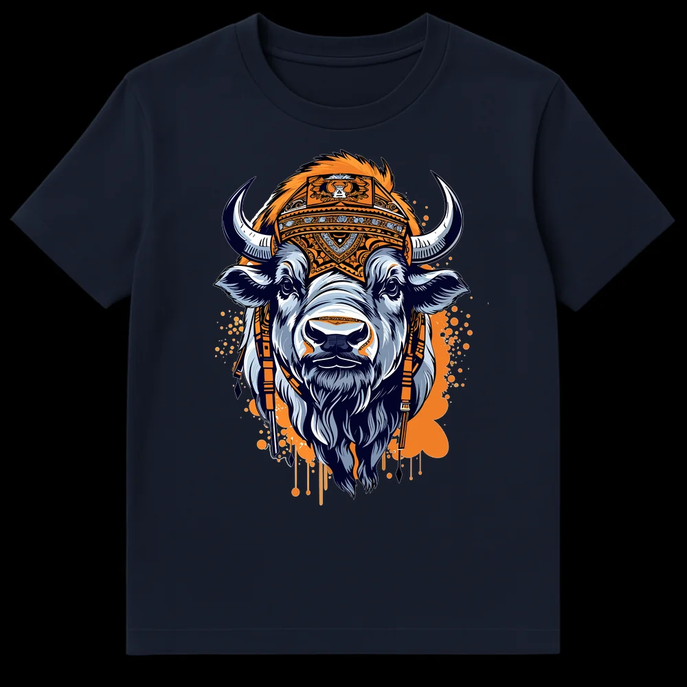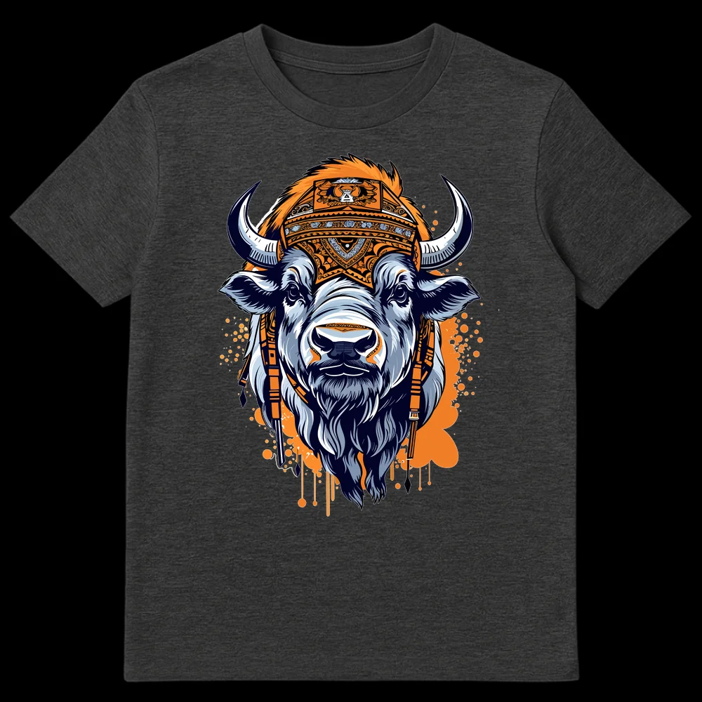 Channel the spirit of the plains with our captivating Tribal Bison Spirit Animal T-Shirt. This isn’t just a garment; it’s a wearable piece of art, showcasing a formidable bison head intricately detailed with powerful horns and a shaggy mane. Adorning the bison is an elaborate, ceremonial-style headdress, rich with geometric and curvilinear patterns, evoking a sense of ancient tradition and spiritual connection. The vibrant orange splatters in the background add a dynamic, energetic touch, making the powerful imagery pop. Perfect for wildlife enthusiasts, art and design lovers, or those who appreciate unique ethnic-inspired aesthetics. This tee makes a bold statement of strength, resilience, and appreciation for nature’s majesty, ideal for expressing your individuality and passion for impactful artistry. Gift it to someone who embodies the wild spirit or cherishes unique cultural designs.