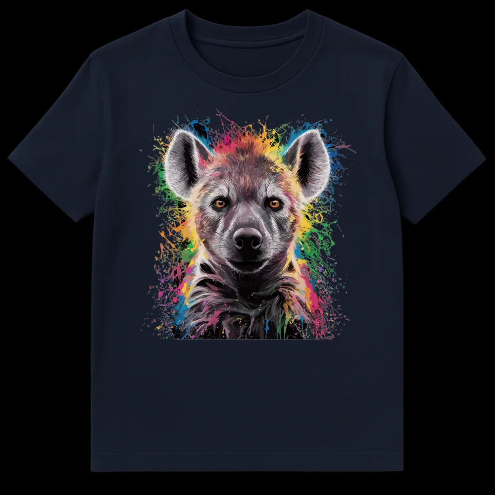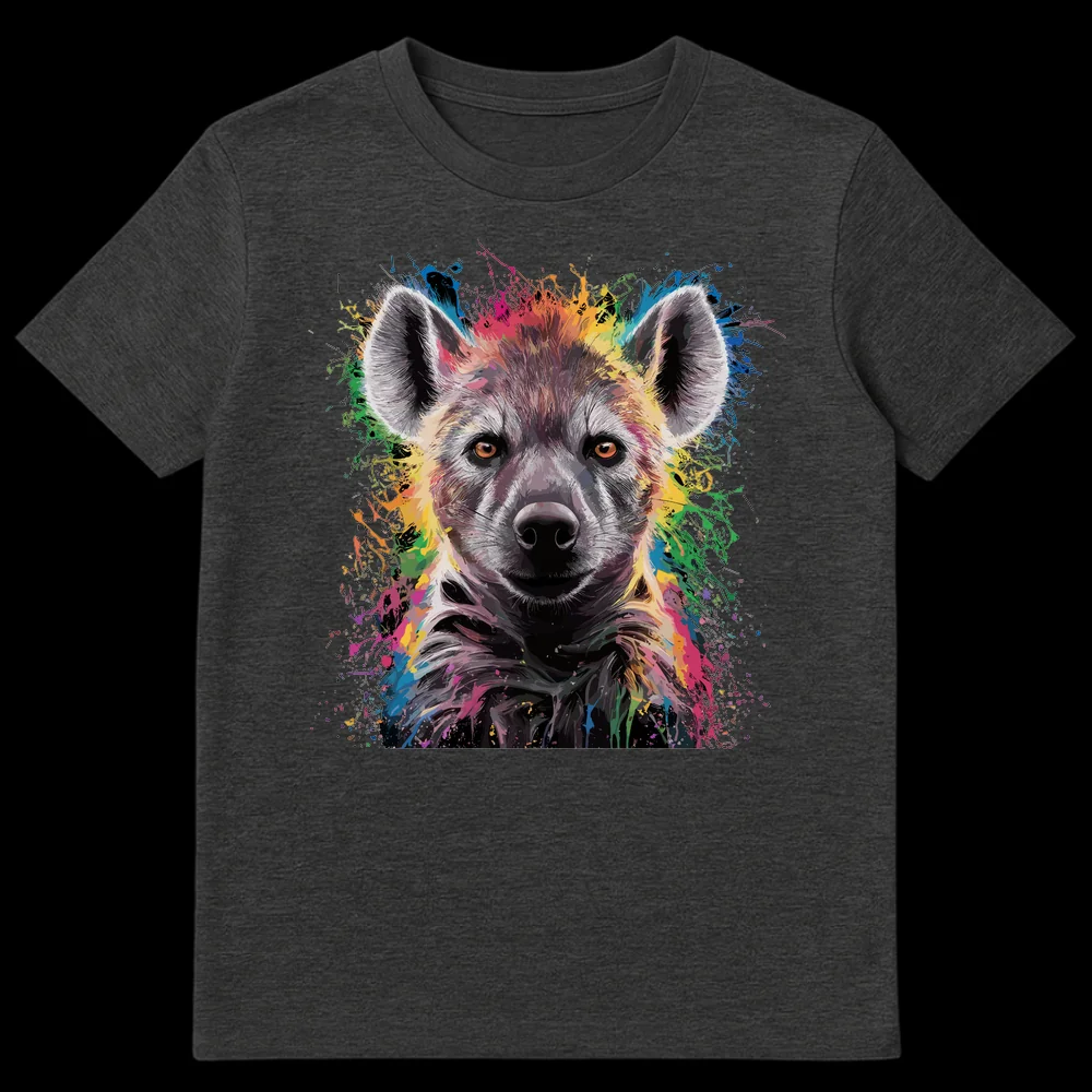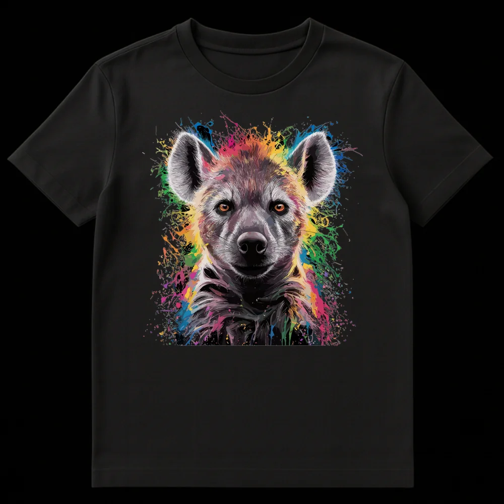 Embrace the wild with our striking Spotted Hyena t-shirt, where realism meets vibrant abstract art. This unique design features a majestic hyena portrait framed by an explosion of rainbow paint splatters, symbolizing dynamic energy and misunderstood beauty. It’s a perfect gift for wildlife lovers, art enthusiasts, or anyone who appreciates bold, expressive animal graphics.