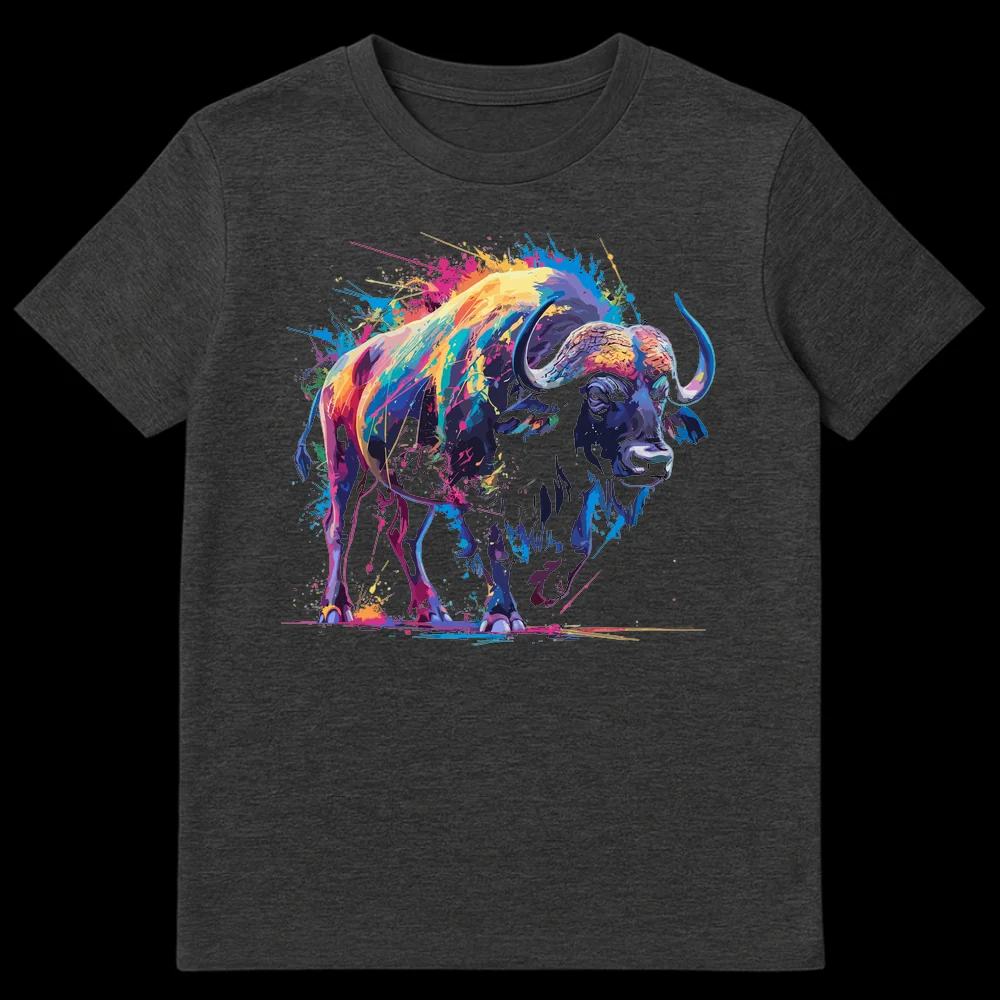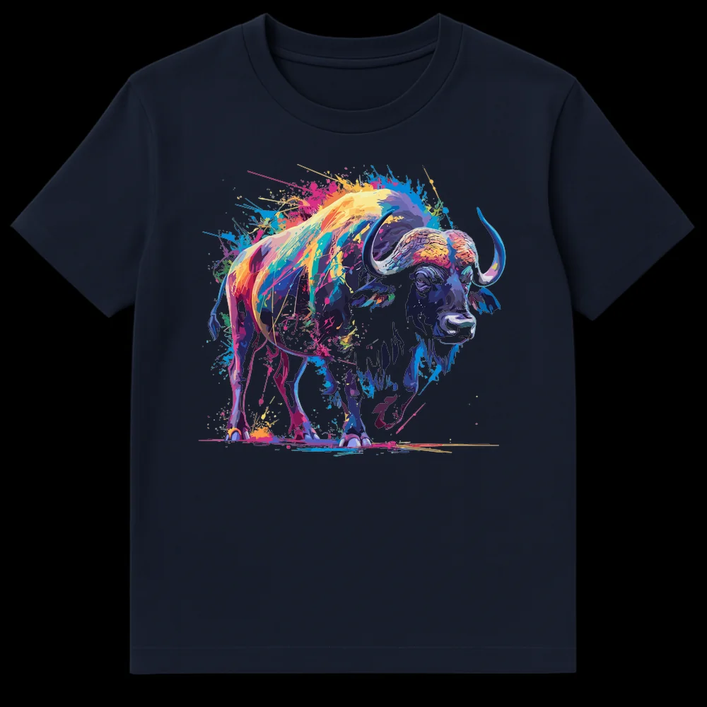 Unleash your wild side with this eye-catching Cape Buffalo tee, a true masterpiece of contemporary abstract art. Featuring a powerful buffalo rendered with dynamic paint splatters in electric blues, vivid pinks, and luminous yellows against a striking black background, this design is pure energy. Perfect for animal lovers, art enthusiasts, or anyone who appreciates bold, expressive fashion, it makes a unique gift for those who want to stand out.