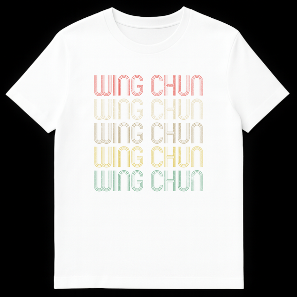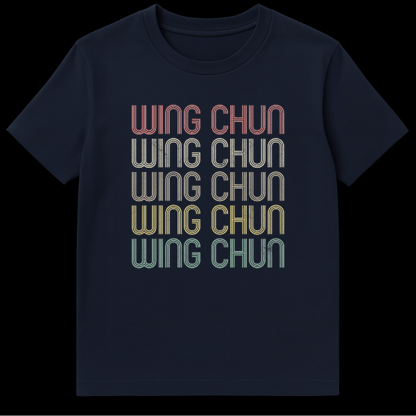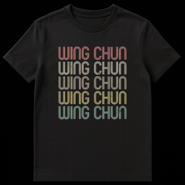 Embrace the legacy of Wing Chun with this distinctive tee featuring the martial art’s name repeated five times in a striking, retro 70s/80s style. Each line of text transitions through a cool, pastel-leaning color spectrum against a bold black background, creating a visually impactful statement. This design is perfect for practitioners, enthusiasts, or anyone who appreciates the history and cultural significance of this renowned kung fu discipline.
