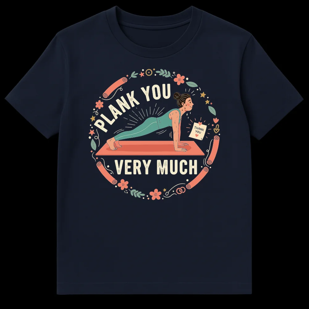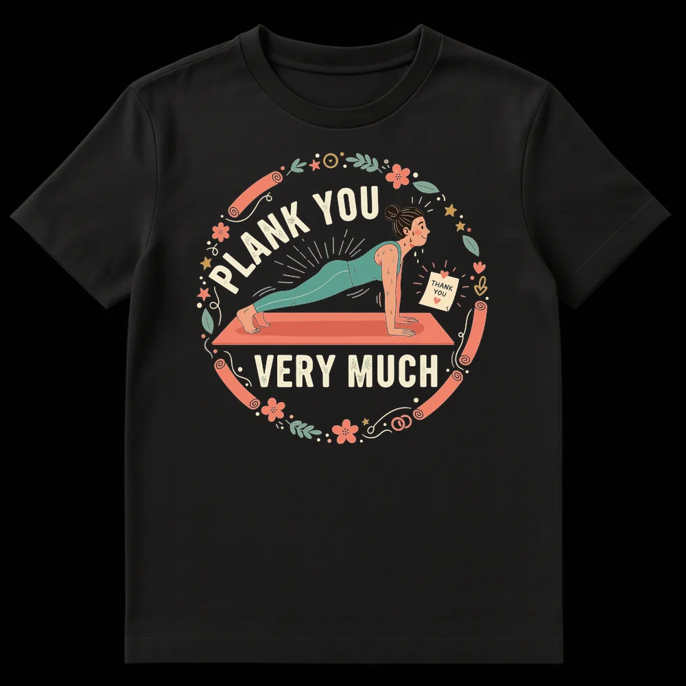 Show off your love for fitness and a great sense of humor with our exclusive “PLANK YOU VERY MUCH” t-shirt. This design brilliantly captures the struggle and triumph of the plank exercise with a whimsical, hand-drawn style illustration of a woman in full plank pose, surrounded by charming floral and yoga-themed elements. The playful pun on “Thank you very much” will instantly resonate with anyone who’s ever endured (and conquered!) a plank, making it a fantastic conversation starter. Crafted for comfort and style, this shirt is an ideal present for yoga enthusiasts, Pilates practitioners, gym-goers, or anyone who enjoys a funny fitness joke. Give the gift of laughter and motivation to your favorite workout warrior!