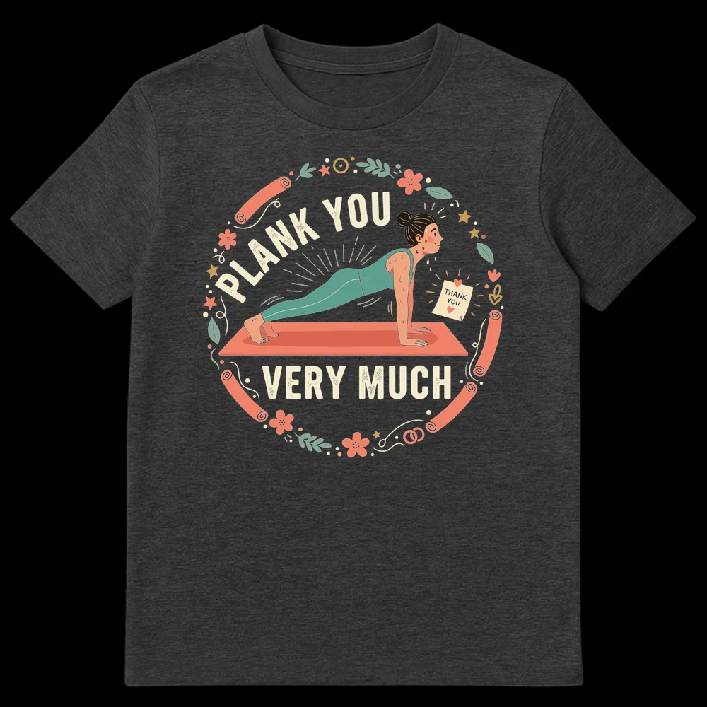 Get ready to plank and laugh with this unique fitness tee! Featuring a determined woman doing a plank amidst floral accents and the clever pun “PLANK YOU VERY MUCH.” It’s a humorous twist on a classic exercise, making it a perfect gift for any yoga instructor, gym buddy, or workout enthusiast who appreciates a good laugh and a challenging core routine.