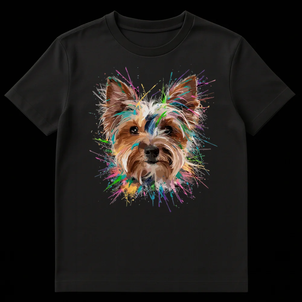 Unleash your passion for pups with our eye-catching Colorful Splatter Yorkie Dog Lover T-Shirt. This unique design brings the lively spirit of a Yorkshire Terrier to life through a dynamic abstract expressionist style. A striking close-up portrait of a Yorkie’s head, rendered with bold brushstrokes, is dramatically encircled by a burst of energetic, vibrant paint splatters in hues of teal, hot pink, lime green, and purple, all popping against a sleek black canvas. There’s no text needed; the art speaks volumes about the joy and vivacity a Yorkie brings into your life. Perfect for dog art lovers, this tee is a wearable celebration of your furry friend, designed to evoke happiness and affection. It makes an incredible gift for Yorkshire Terrier owners, breeders, or anyone who adores unique pet-themed apparel and isn’t afraid to show their colorful personality.
