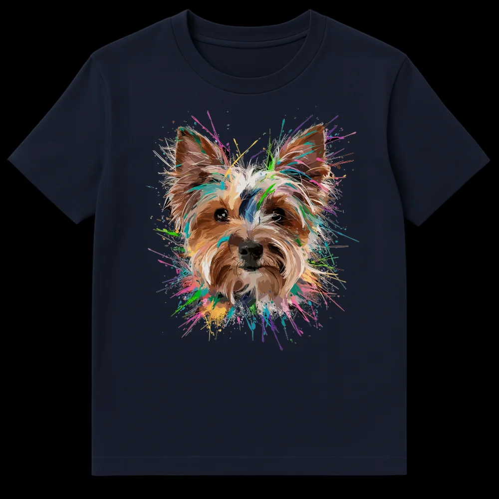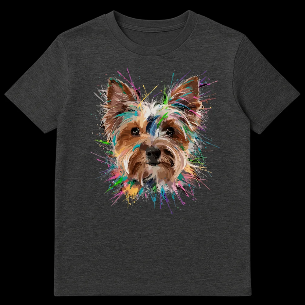 Celebrate your love for Yorkies with this vibrant abstract expressionist t-shirt. Featuring a bold Yorkshire Terrier portrait surrounded by an explosion of colorful paint splatters against a deep black background, this design perfectly captures the playful and energetic spirit of your beloved pet. It’s an artistic and expressive statement piece, making it an ideal gift for any Yorkie owner or dog art enthusiast who loves unique, eye-catching designs.
