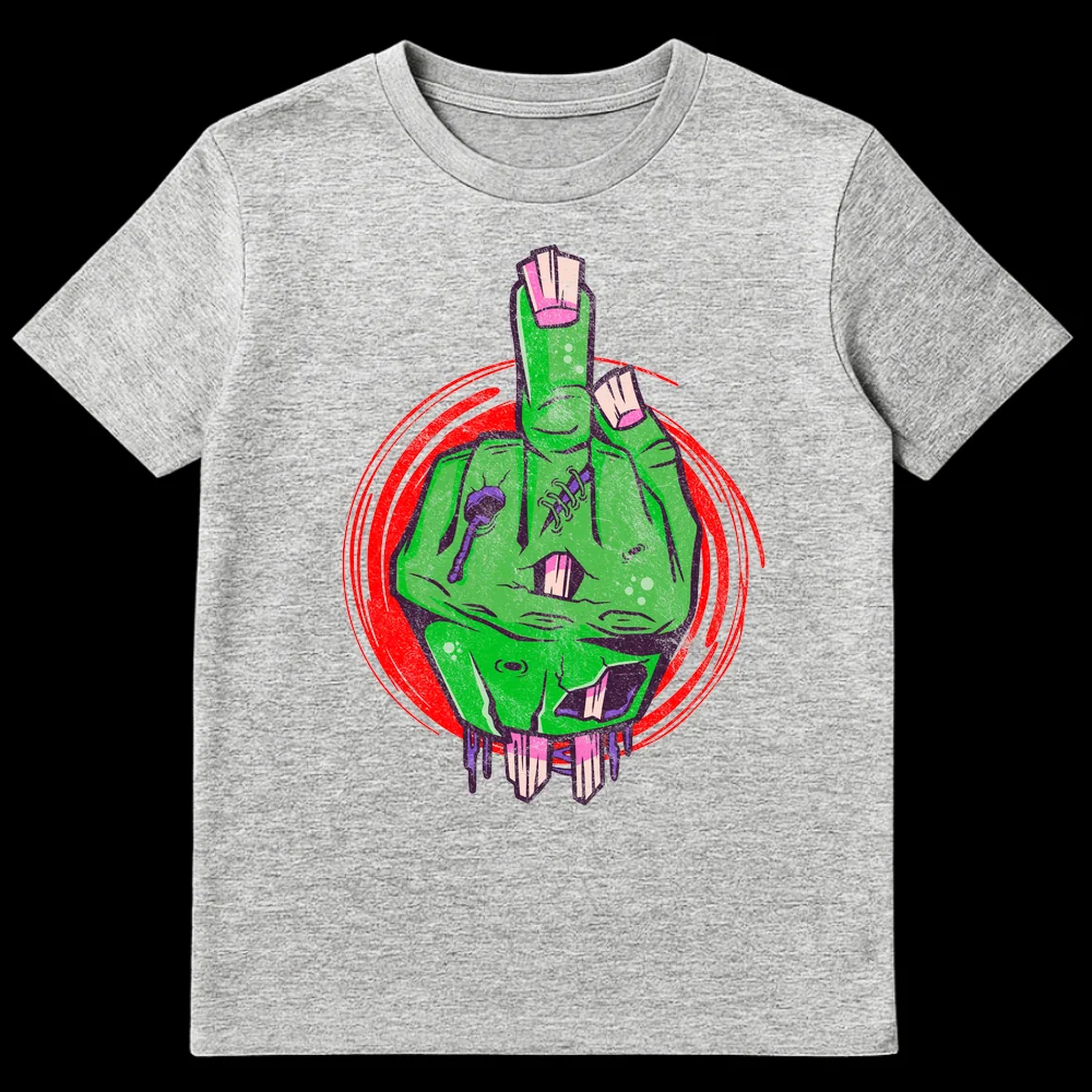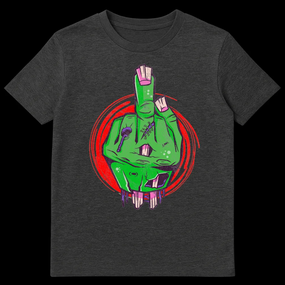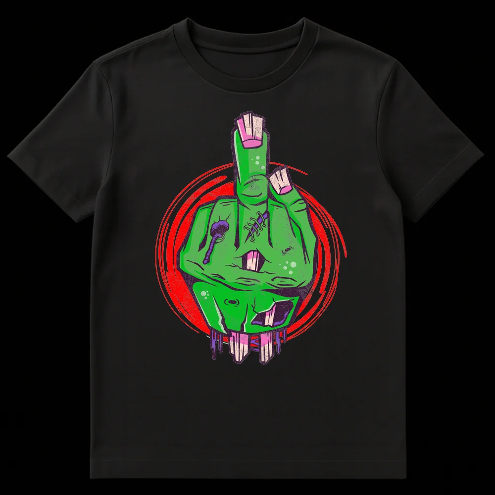 Unleash your inner rebel with this edgy zombie middle finger t-shirt. Featuring a decaying green zombie hand giving the universal ‘flip off’ gesture, this design blends macabre horror with dark humor. The distressed, grungy style with vibrant greens and purples makes it a unique statement piece. Perfect for horror enthusiasts or anyone with an anti-establishment attitude.