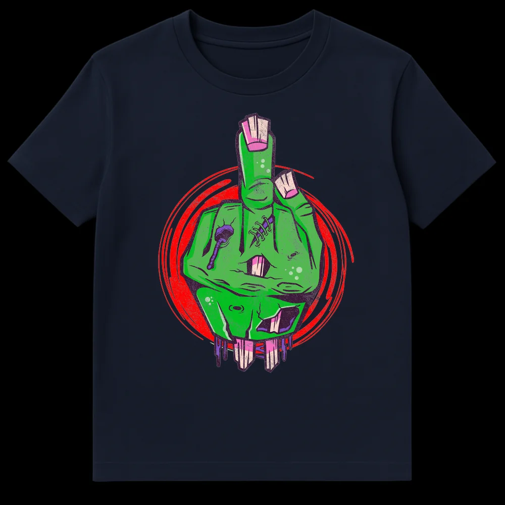 Embrace the undead attitude with our striking Zombie Middle Finger T-Shirt, a perfect blend of macabre horror and rebellious dark humor. This unique graphic tee showcases a ghoulish, decaying green zombie hand defiantly raising its middle finger, surrounded by a distressed red swirl. The vibrant lime green skin, visible bone details, and crude stitches highlight its gruesome charm, while thick purple outlines give it a bold, comic book-inspired edge. This isn’t just a t-shirt; it’s a statement for those who appreciate horror, have a cynical wit, and aren’t afraid to express their ‘I don’t care’ attitude. Ideal for horror movie buffs, zombie genre fans, Goths, Punks, or anyone with an alternative style. It makes an unforgettable gift for Halloween, birthdays, or just to celebrate that wonderfully defiant person in your life. Stand out from the crowd and let this zombie do the talking!